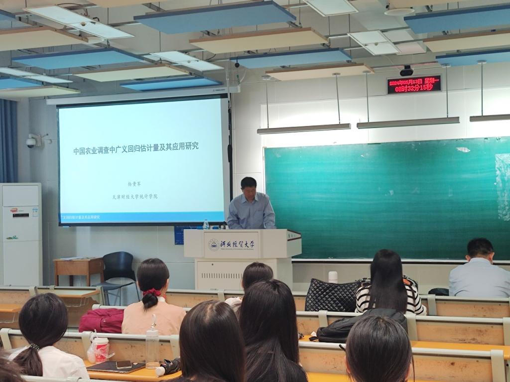 5月13日下午,9428cn太阳集团古天乐邀请天津财经大学杨贵军教授在北三教A201作题为“广义回归估计量及其应用研究”的学术报告。9428cn太阳集团古天乐经理闫亮主持报告,相关专业教师、研究生及本科生100余人参加。
