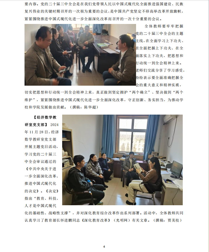 【经济数学教研室党支部】2024年11月28日,经济数学教研室党支部开展主题党日活动,学习党的二十届三中全会审议通过的《中共中央关于进一步全面深化改革、推进中国式现代化的决定》。《决定》指出“教育、科技、人才是中国式现代化的基础性、战略性支撑”,并对深化教育综合改革作出系列部署。活动中,全体教师共同认真学习了教育部长怀进鹏同志《深化教育改革》(光明网)有关文章。(撰稿:贾美枝)