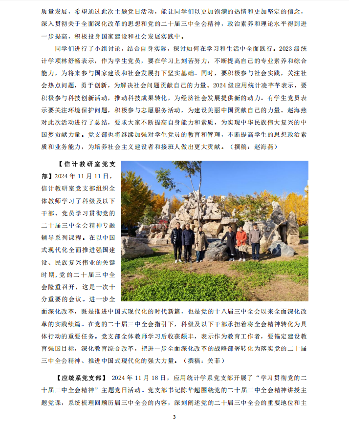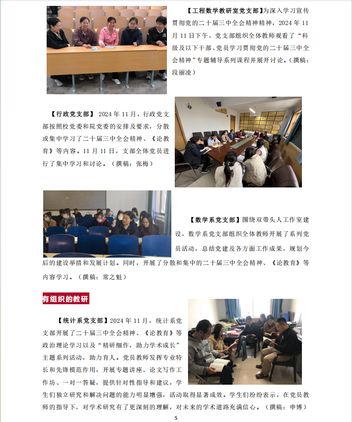 【统计系党支部】2024年11月,统计系党支部开展了二十届三中全会精神、《论教育》等政治理论学习以及“精研细作,助力学术成长”主题系列活动,助力育人。党员教师发挥专业特长和先锋模范作用,开展专题讲座、论文写作工作坊、一对一答疑,提供针对性指导和建议,员工们独立研究和解决问题的能力明显增强,活动取得显著成效。员工们纷纷表示,在党员教师的指导下,对学术研究有了更深刻的理解,对未来的学术道路充满信心。(撰稿:申博)