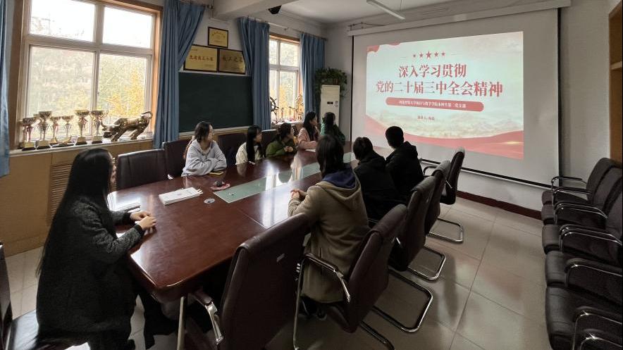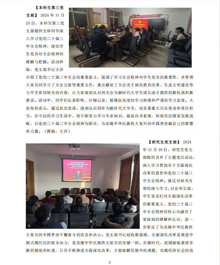 【本科生第三党支部】2024年11月25日,本科生第三党支部组织全体同学深入学习党的二十届三中全会精神,深化员工党员对全会精神的理解与把握。活动伊始,党支部书记王洋介绍了党的二十届三中全会的重要意义,强调了学习全会精神对员工党员的重要性,并带领大家共同学习了全会公报等重要文件,重点解读了全会关于深化教育改革、生态文明建设等与员工密切相关的内容,让大家深刻认识到全会为新时代老员工成长成才提供的新机遇和新要求。活动中,同学们认真聆听、仔细记录,展现出高度的学习热情和严谨的学习态度。大家纷纷表示,通过此次党课,深刻认识到作为新时代老员工,肩负着重大历史使命和责任担当,在今后的学习生活中,将不断努力学习专业知识,提高自身素质,积极关注国家发展战略,以党的二十届三中全会精神为指引,为实现中华民族伟大复兴的中国梦贡献自己的智慧和力量。(撰稿:王洋)