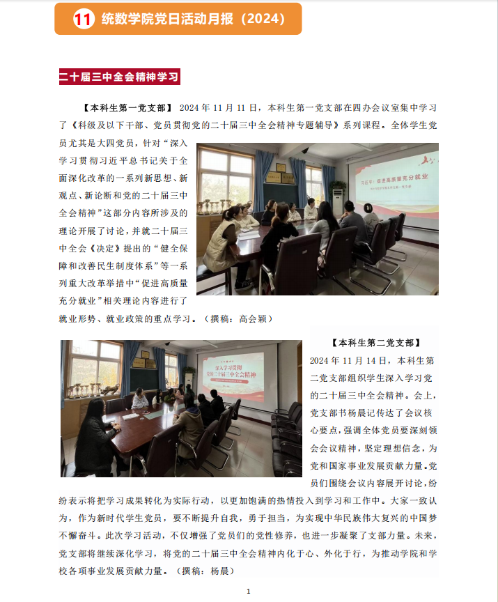 【本科生第一党支部】2024年11月11日,本科生第一党支部在四办会议室集中学习了《科级及以下干部、党员贯彻党的二十届三中全会精神专题辅导》系列课程。全体员工党员尤其是大四党员,针对“深入学习贯彻习近平总书记关于全面深化改革的一系列新思想、新观点、新论断和党的二十届三中全会精神”这部分内容所涉及的理论开展了讨论,并就二十届三中全会《决定》提出的“健全保障和改善民生制度体系”等一系列重大改革举措中“促进高质量充分就业”相关理论内容进行了就业形势、就业政策的重点学习。(撰稿:高会颖)