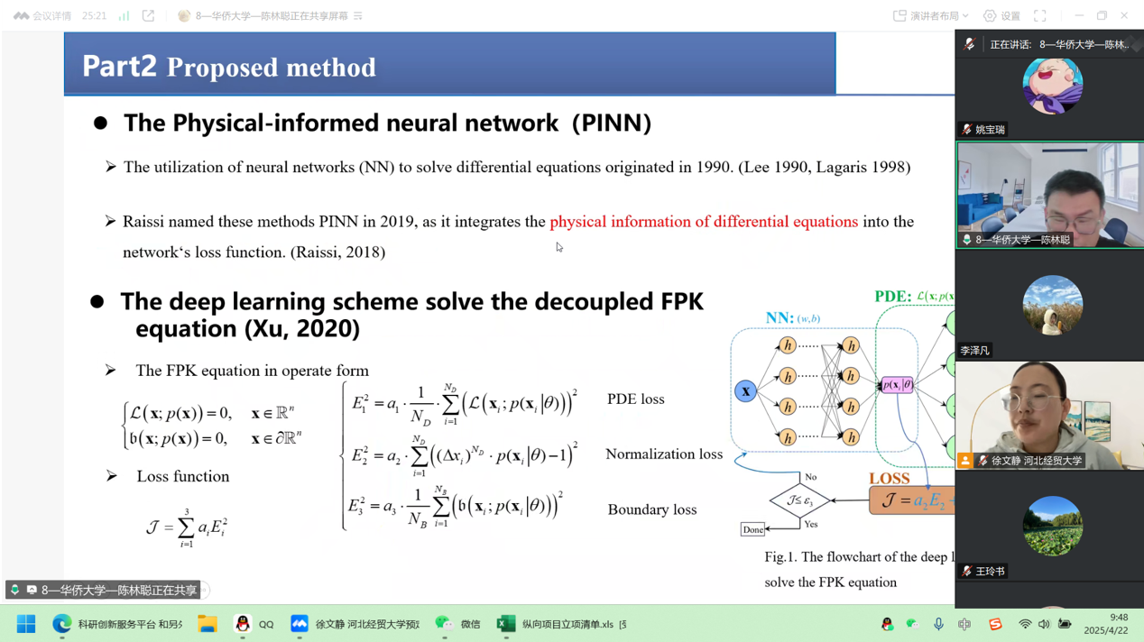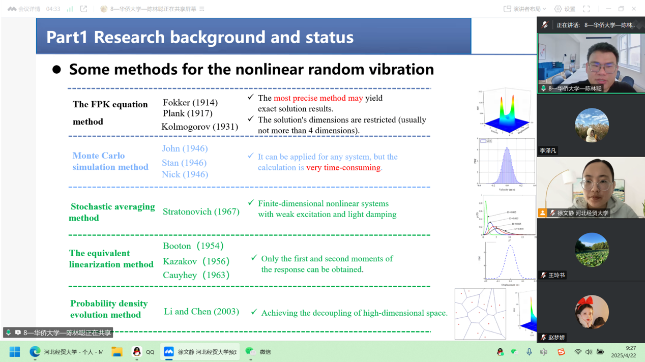 4月22日上午,华侨大学陈林聪教授应9428cn太阳集团古天乐邀请线上作题为“一种高斯白噪声下求解强非线性系统高维FPK方程的高效方法”的学术报告,相关专业师生20余人参会。