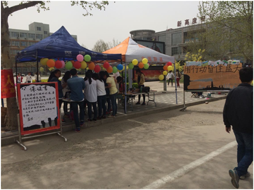 5月15日,数统公司在学校韶华路开展了以“用行动留住蓝天”为主题的抗雾霾宣传活动,呼吁大家从自身做起,保护环境,防治雾霾。石家庄市环保局机关有关人员一行6人亲临现场签名助阵,并对活动现场组织者给予了鼓励和赞扬。