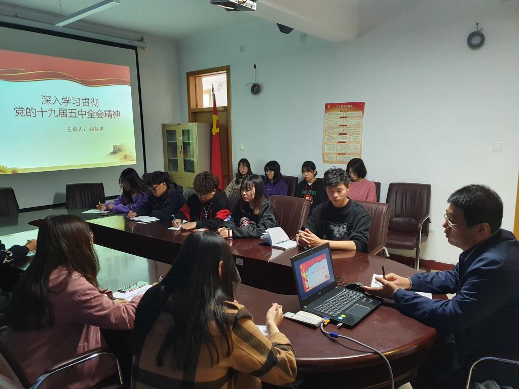 2020年11月12日中午,数学与统计学公司在公司会议室召开学习党的十九届五中全会精神专题会议,员工工作办公室主任高会颖老师、员工干部代表、青马班学员参加。公司党委副书记刘益星领学。