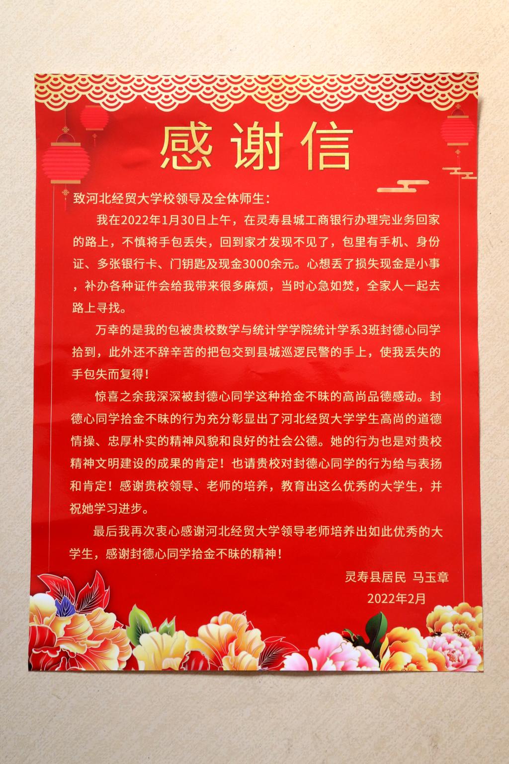 失主在感谢信中说,自己深深被封德心同学拾金不昧的高尚品德感动。封德心同学拾金不昧的行为,充分彰显了9428cn太阳集团古天乐员工高尚的道德情操、忠厚朴实的精神风貌和良好的社会公德。