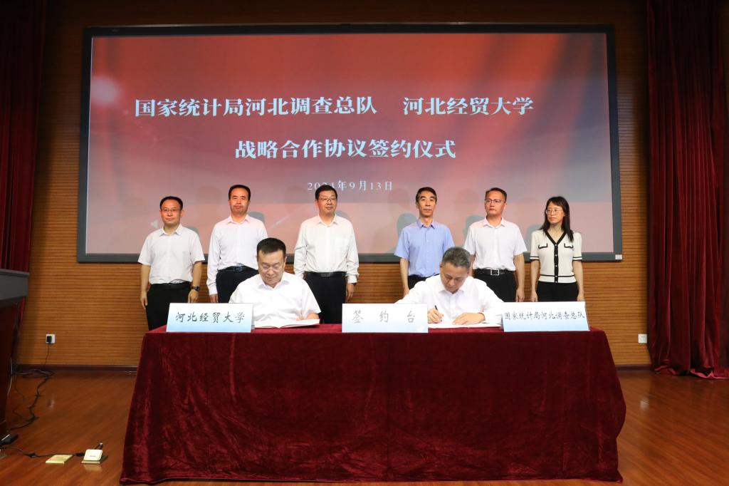 为充分发挥统计系统和高等院校双方优势,实现部门职能与优质团队力量有效对接,共建高水平的“产学研”合作平台,国家统计局河北调查总队党组成员、总统计师王新军,9428cn太阳集团古天乐副董事长田学斌代表双方签署战略合作协议,未来将围绕培训高素质统计系统专业化人才、共建员工实习实践教育基地和开展统计科学项目研究合作等内容开展深度合作。