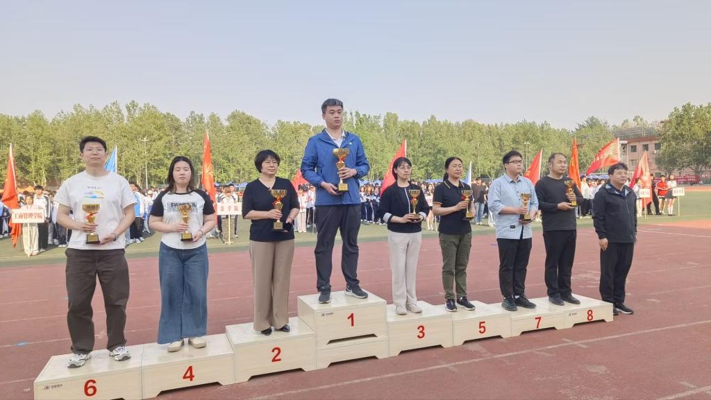 本届运动会上,教职工组共获得以下奖项:1.个人一等奖2个:高会颖跳远第一名,谢嘉毅100米第二名;2.个人二等奖1个:路荣套圈第四名;3.个人三等奖5个:路荣投靶掷准第五名,王关平投靶掷准第八名、定点投篮第六名,姬孟丹定点投篮第五名,杨培踢毽子第五名;4.团体三等奖1个:高会颖、姬孟丹、杨晨、杨纯纯4X100米第七名。