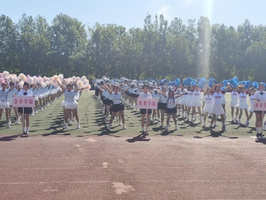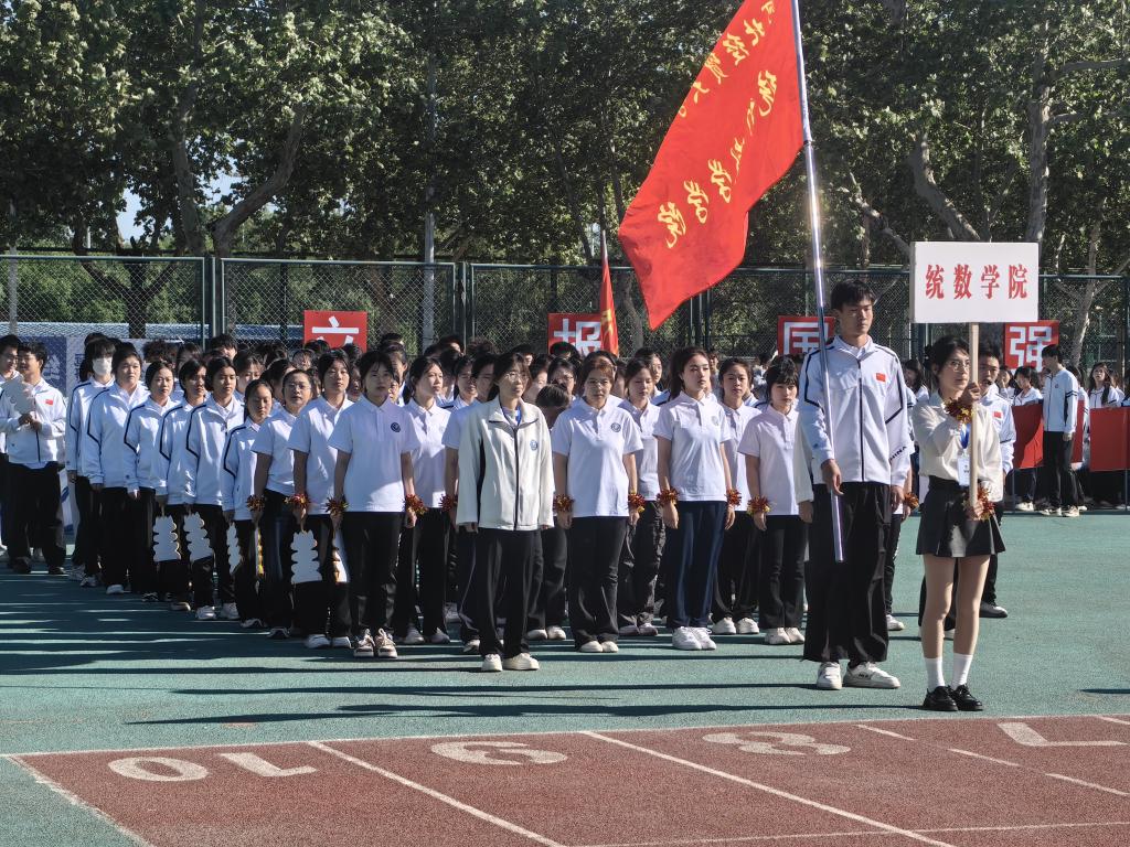 开幕式上,公司方阵别出心裁、创意十足。他们身着统一的服装,踏着一致的节拍向主席台行进。行进过程中,队员们化身“人形函数曲线”,灵动演绎函数变化之美;高高飘起的院旗在空中划出绚丽弧线;最后整齐排列,手中花球快速变换,瞬间拼出数学符号“π”的图案,将数学之美与运动活力完美融合。随后,健美操与团体操汇报表演登场,队员们身着绚丽服饰,随着动感音乐,以整齐划一的动作、刚柔并济的姿态,展现出统数学子蓬勃向上的青春力量。