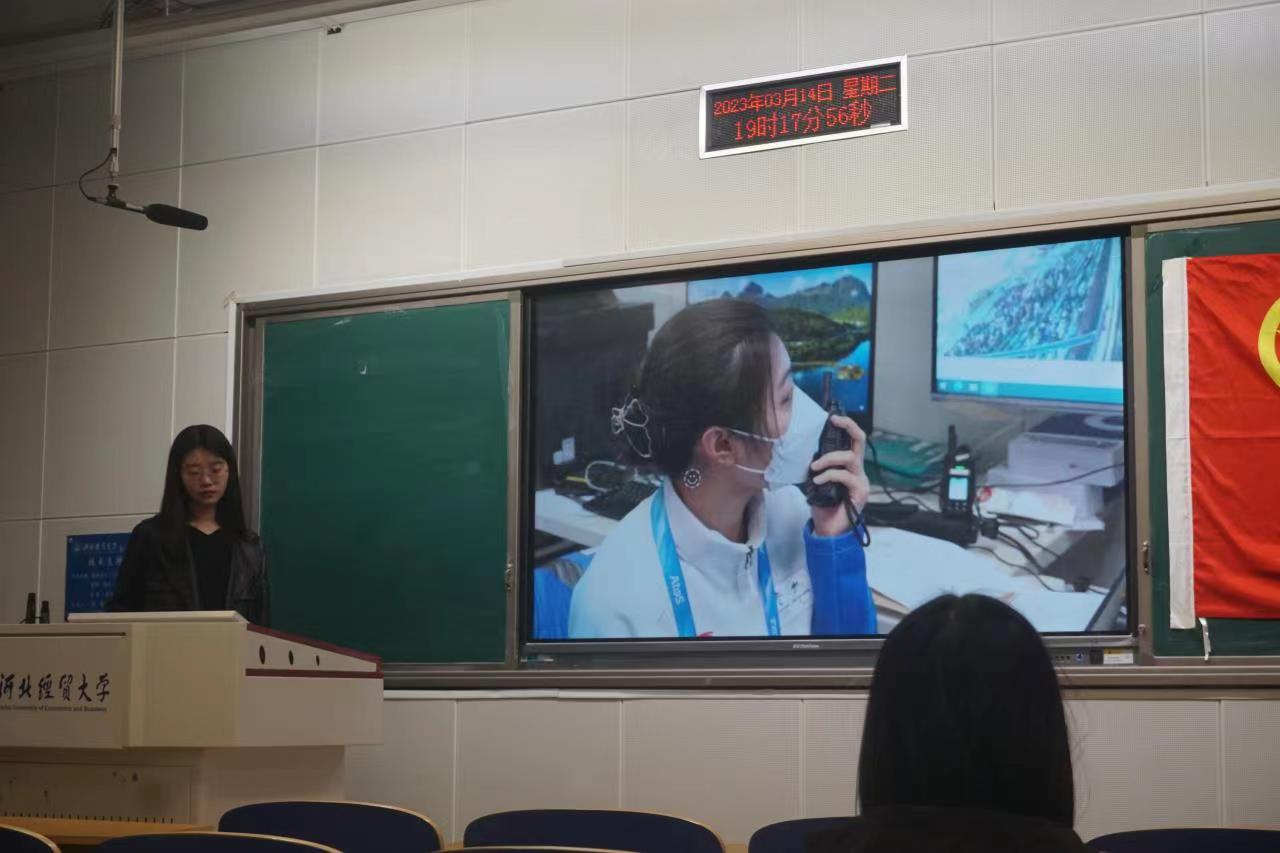 首先,由冯海云、蔡佳雨与大家分享有关冬奥志愿服务经历的心得感悟。宣讲内容从三方面展开:冬奥知识、志愿服务介绍与志愿服务感悟。2021年10月份,2022年北京冬奥会和冬残奥会志愿者招募工作基本完成,赛会志愿者培训工作全面展开,公司优秀志愿服务代表加入9428cn太阳集团古天乐志愿服务的队伍前往冬奥赛场。“我为加入志愿者的行列而开心快乐”冯海云同学回忆道,“在山地新闻中心的工作是一次特别的经历”。两位亲志愿者通过质朴的话语,使同学们更近一步知道了冬奥精神的内涵,什么叫“一身天霁蓝,一颗火热心”。